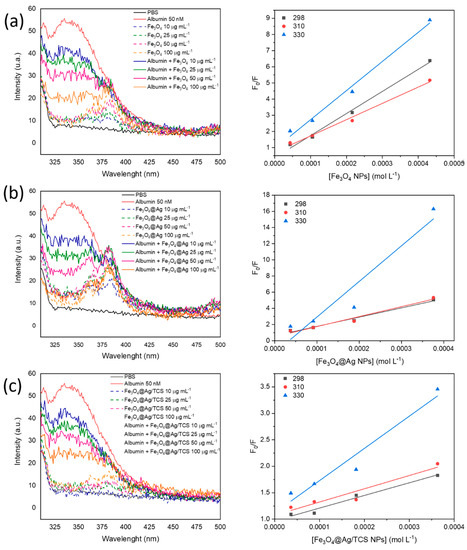 Fluorescence spectra and Stern-Volmer plot of F0/F vs. NPs concentration ([NP]) for (a) Fe3O4 NP, (b) Fe3O4@Ag, and (c) Fe3O4@Ag/TCS incubated with albumin at 298, 310, and 330 K. The concentrations of NPs were given in mol L−1, taking into account the molar mass of magnetite NPs and the proportion of this NP in the other materials (87% in Fe3O4@Ag and 84% in Fe3O4@Ag/TCS).