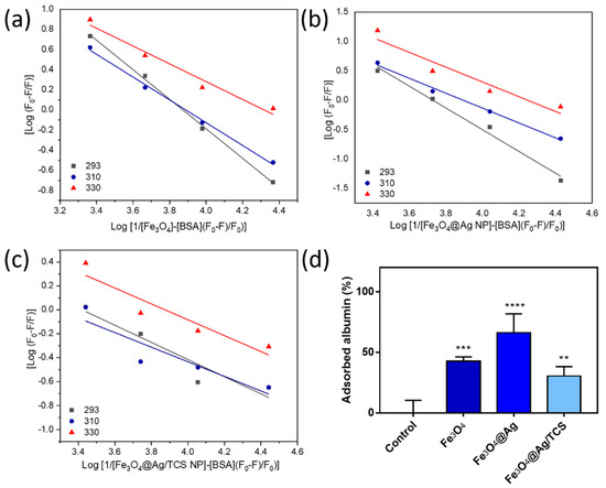 Plot of Log ((F0 − F)/F) vs. Log (1/([NP] − [BSA](F0 − F)/F0)) for (a) Fe3O4 NPs and (b) Fe3O4@Ag NPs, and (c) Fe3O4@Ag/TCS NPs incubated with albumin, as a function of the temperature; (d) adsorbed albumin (%) after the incubation of 0.4 g L−1 of protein with 200 µg mL−1 of Fe3O4 NPs, Fe3O4@Ag NPs, and Fe3O4@Ag/TCS NPs. ** p < 0.0013, *** < 0.0006, and **** p < 0.0001, comparing to control, using Tukey’s multiple comparisons test.