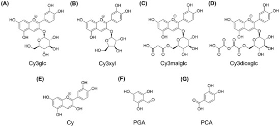 Anthocyanins are water-soluble pigments of plants and responsible not only for the red, blue or purple colors of many flowers, but also of a spectrum of fruits and vegetables [1]. An increasing number of studies have indicated that the consumption of anthocyanin-rich fruits and vegetables are inversely associated with inflammatory stress. Thus, a higher intake is considered to result in a lower prevalence of cancer, cardiovascular and Alzheimer’s disease [2,3,4]. In particular, different types of berries such as elder-, blue-, choke- and blackberries represent rich sources of anthocyanins and are well described for their antioxidant properties [5,6].