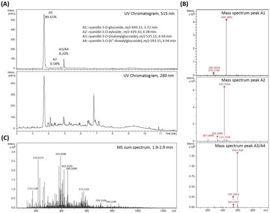 Polyphenolic profile of blackberry raw juice, analyzed by LC–UV/MS. (A) UV–chromatograms at 515 nm (top), with percentage of total anthocyanin content calculated from integrated peak areas, and 280 nm (bottom) from 2–12 min. (B) Sum of mass spectra from retention time 3.6–3.9 min (anthocyanin A1), 4.35–4.45 min (anthocyanin A2), and 4.9–5.0 min (anthocyanin A3 and anthocyanin A4). (C) Sum of mass spectra acquired from MS direct injection, showing all detected masses and their abundances. Tentative annotation based on MS/MS fragmentation pattern (Supplementary Figure S1) and comparison with literature data.