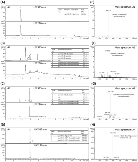 LC-UV/MS analysis of isolated anthocyanin fractions. (A–D) UV-chromatograms at 515 nm (top) and 280 nm (bottom) from 2–12 min; and (E–H) sum of mass spectra of fractions anthocyanin A1, anthocyanin A2, anthocyanin A3 and anthocyanin A4, obtained from MS direct injection. Tentative annotation based on MS/MS fragmentation pattern (Supplementary Figure S3) and comparison with literature data; n.a.: not annotated.