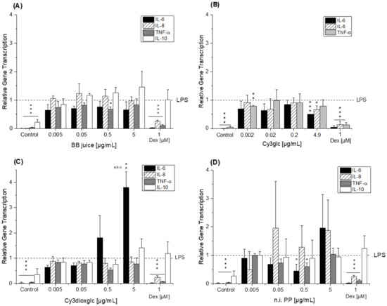 Relative transcript levels of IL-6, IL-8 and TNF-α in THP-1 derived macrophages pre-incubated (2 h) with (A) BB juice, (B) Cy3glc, (C) Cy3dioxglc and (D) n.i. PP and subsequently challenged by LPS for another 3 h. Dexamethasone (Dex; 1 µM) served as positive control. BB juice = pure juice extract; Cy3glc = cyanidin-3O-glucoside; Cy3dioxglc = cyanidin-3O- (6″-dioxalylglucoside); n.i. PP = fraction of non-identified polyphenols. Values shown are the means + SD of at least three independent experiments presented as relative gene transcription, normalized to β-actin and GAPDH and compared to LPS stimulated cells (calibrator, y = 1). Statistical differences were calculated with a one-sample t-test (* p, ** p, *** p < 0.05, 0.01, 0.001). Significant differences among the test concentrations were calculated by one-way ANOVA (p < 0.05, a–c).