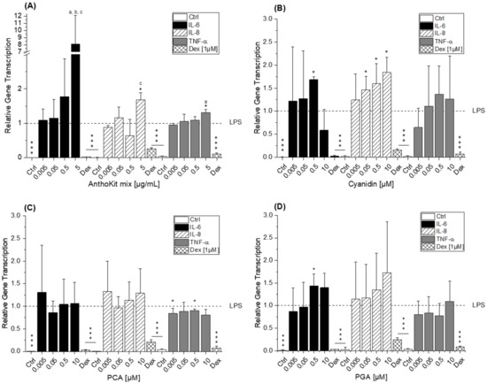 Relative transcript levels of IL-6, IL-8 and TNF-α in THP-1 derived macrophages pre-incubated (2 h) with (A) AnthoKit mix, (B) cyanidin, (C) PCA (protocatechuic acid) and (D) PGA (phloroglucinol aldehyde) and subsequently challenged by LPS for another 3 h. Dexamethasone (Dex; 1 µM) served as positive control. AnthoKit mix = mixture comprising all purified anthocyanin fractions based on their natural composition in the blackberry juice. Values shown are the mean + SD of at least three independent experiments presented as relative gene transcription, normalized to β-actin and GAPDH and compared to LPS stimulated cells (calibrator, y = 1). Statistical differences were calculated with a one-sample t-test (* p, *** p < 0.05, 0.001). Significant differences among the test concentrations were calculated by one-way ANOVA (p < 0.05, a–c).