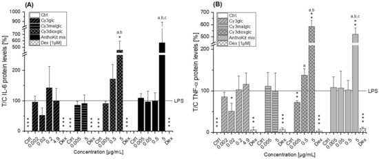 Release of (A) IL-6 and (B) TNF-α from THP-1 derived macrophages pre-incubated (2 h) with Cy3glc, Cy3malglc, Cy3dioxglc and AnthoKit mix and subsequently challenged by LPS for another 18 h. Dexamethasone (Dex; 1 µM) served as positive control. AnthoKit mix = mixture comprising all purified anthocyanin fractions based on their natural composition in the blackberry juice. Values plotted are the mean + SD of three independent experiments and presented as test over control compared to LPS stimulated cells. Significant differences among the test concentrations were calculated with one-way ANOVA (p < 0.05, a–c). Statistical differences compared to the LPS stimulus were calculated with a one-sample t-test (* p, ** p, *** p < 0.05, 0.01, 0.001). No statistical evaluation could be performed for the solvent controls in 5B since measured TNF-α levels equaled 0 ng/µL.