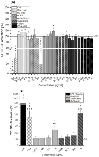 Modulation of NF-κB activity by (A) BB juice, n.i. PP, AnthoKit mix, Cy3dioxglc, Cy3glc and PGA pre-incubated for 2 h and subsequently additionally stimulated with LPS for 18 h and (B) AnthoKit mix and Cy3dioxglc incubated for 20 h in differentiated THP1-Lucia™ NF-κB cells expressing the NF-κB-regulated reporter gene luciferase. Dexamethasone (Dex; 1 µM) served as positive control. BB juice = pure blackberry extract; n.i. PP = fraction of non-identified polyphenols; AnthoKit mix = mixture comprising all purified anthocyanin fractions based on their natural composition in the blackberry juice; Cy3dioxglc = cyanidin-3O-(6″-dioxalylglucoside); Cy3glc = cyanidin-3O-glucoside; PGA = phloroglucinol aldehyde. Values shown are the mean + SD of at least three independent experiments and presented relative to the LPS stimulus or the solvent control (=100%). Significant differences among the test concentrations were calculated with one-way ANOVA (p < 0.05, a–c). Statistical differences compared to the respective control (100%) were calculated with a one-sample t-test (* p, ** p, *** p < 0.05, 0.01, 0.001) or with a two-sample t-test between LPS and Dex (### p < 0.001).