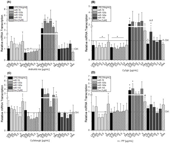 LPS-stimulation of THP-1 derived macrophages did not significantly affect miR-16 and miR-155 transcription. Only a minor, yet significant, decline of miR-155 was detected in the data set of Cy3glc. LPS slightly reduced miR-125b levels, however without statistical significance (Figure 8). In contrast, LPS-stimulation led to an increase of miR-146a by more than 2-fold, with statistical significances observed in the data set of Cy3glc and n.i. PP (* p < 0.05; Figure 8B,D). miR-16 levels were not significantly affected by the tested compounds. Results regarding the effect of Cy3glc potentially indicate a reducing effect on miR-16 levels as statistics indicate a significant difference between 0.02 and 4.9 µg/mL (Figure 8B).