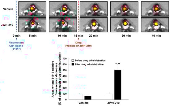 To investigate the distribution of JWH-210 on the central nervous system, we conducted imaging analysis using T1117, a fluorescent form of the CB1 ligand AM-251 (Bio-Techne Corporation, Minneapolis, MN, USA). Mice were anesthetized with pentobarbital (50 mg/kg, i.p.) and placed in a stereotaxic apparatus. The stereotaxic coordinates of the cerebral ventricle were 0.3 mm anterior to bregma, 1.0 mm lateral to the sagittal suture, and 2.5 mm ventral to the brain surface. T1117 was injected into the right cerebral ventricle (intracerebroventricular injection; 10 μL, 5 mM in DMSO). Fifteen minutes later, JWH-210 was injected intraperitoneally (i.p., 0.1 mg/kg body weight). The fluorescent signal was measured using an IVIS spectrum in vivo imaging system (PerkinElmer, Waltham, MA, USA). The signal was measured in the presence and absence of JWH-210. While imaging was in progress, the mice remained unconscious and mice’s heads were immobilized. The signal area was targeted to a specific color using Adobe Photoshop® CC 2018 (Adobe, Park Avenue, CA, USA). The value of the signal area was measured using the ImageJ 1.53k (Wayne Rasband, National Institutes of Health, Bethesda, MD, USA) and was the percentage based on the value for 10 min prior to vehicle administration.