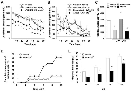Effects of JWH-210 on behavioral tests. (A) Mice were injected with either vehicle or JWH-210 (0.05 or 0.1 mg/kg, i.p.). Locomotor activity was measured at 5 min intervals for 60 min. Data are expressed as the mean distance traveled ± S.E. (n = 10) and were analyzed using two-way RM ANOVA followed by Bonferroni post-hoc t-test [** p < 0.01 vs. vehicle group; # p < 0.05 and ## p < 0.01 vs. vehicle group (at the same time point)]. (B,C) Mice were injected with either vehicle or rimonabant (CB1 antagonist, 1 mg/kg) or AM630 (CB2 antagonist, 3 mg/kg) 30 min prior to JWH-210 (0.1 mg/kg, i.p.) injection. (B) Locomotor activity was measured at 5 min intervals for 60 min. Data are expressed as the mean distance traveled ± S.E. (n = 6–7) and were analyzed using two-way RM ANOVA followed by Bonferroni post-hoc t-test [* p < 0.05 vs. vehicle + vehicle group (at the same time point); # p < 0.05 vs. rimonabant + JWH-210 group (at the same time point)]. (C) Total locomotor activity was measured for 60 min. Data are expressed as the mean total distance traveled ± S.E. (n = 6–7) and were analyzed using one-way ANOVA followed by Holm–Sidak post-hoc t-test (* p < 0.05 vs. vehicle + vehicle group; # p < 0.05 vs. vehicle + JWH-210 group; $ p < 0.05 vs. rimonabant + JWH-210 group). (D,E) Mice were injected with either a vehicle or JWH-210 (0.1 mg/kg, i.p.) once every day for 5 days, and then behavior tests were performed. (D) The cumulative frequency of jumping events (%) was measured by CAR test. Data are expressed as the differences between vehicle group and JWH-210 group curves, and were analyzed using Fisher’s exact test (* p < 0.05). (E) The sensorimotor gating was measured by PPI test. Data are expressed as the mean ± S.E. (n = 10) and were analyzed using two-way RM ANOVA followed by Bonferroni post-hoc t-test [** p < 0.01; # p < 0.05 and ## p < 0.01 vs. vehicle group (on the same dB)].