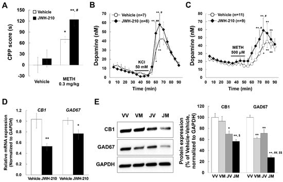 Effects of JWH-210 on METH-induced CPP, KCl-induced dopamine release, or METH-induced dopamine efflux and CB1 and GAD67 expression in mice striatum. Before starting the CPP test, acute brain slices, and dissecting the brain, mice were injected with either a vehicle or JWH-210 (0.1 mg/kg, i.p.) once every day for 5 days. (A) 0.3 mg/kg METH-induced CPP scores (s) was measured by CPP test. Data are expressed as the mean ± S.E. (n = 13) and were analyzed using two-way ANOVA followed by Bonferroni post-hoc t-test (* p < 0.05 and ** p < 0.01 vs. each vehicle group; # p < 0.05 vs. vehicle/METH group). (B) 50 mM KCl-induced dopamine release or (C) 500 μM METH-induced dopamine efflux in brain striatal slices were measured by using HPLC. Data are expressed as the mean ± S.E. (n = number of mice) and were analyzed using two-way RM ANOVA followed by Bonferroni post-hoc t-test [* p < 0.05, ** p < 0.01, and ** p < 0.01 vs. each basal level (at 30 min); # p < 0.05 and ## p < 0.01 vs. vehicle group on the same time]. (D) Mice striatum were collected after 1 day following the final injection. mRNA levels of CB1 and GAD67 were detected by qPCR and normalized relative to the amplification of GAPDH in the mice striatum. Data are expressed as the mean ± S.E. (n = 5–9, Student’s t-test; * p < 0.05 and ** p < 0.01 vs. vehicle group). (E) Mice striatum were collected after CPP test. The protein expression of CB1 and GAD67 was detected by Western blotting using specific antibodies and normalized to the relative amplification of GAPDH. Data are expressed as the mean total distance traveled ± S.E. (n = 5) and were analyzed using one-way ANOVA followed by Holm–Sidak post-hoc t-test (* p < 0.05 and ** p < 0.01 vs. VV group; ## p < 0.01 vs. VM group; $ p < 0.05 vs. JV group, $$ p < 0.01 vs. JV group). METH: methamphetamine. VV: vehicle + vehicle group. VM: vehicle + methamphetamine group. JV: JWH-210 + vehicle group. JM: JWH-210 + methamphetamine group.