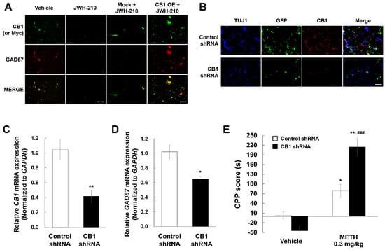 Effects of CB1 knockdown on GAD67 expression in primary cultured neurons and METH-induced CPP. (A) Vehicle group was treated with vehicle (5% DMSO, 5% tween-20, 90% PBS) as the same amount of JWH-210 for 24 h. JWH-210 group was treated with 0.1 μM JWH-210 for 24 h. Mock + JWH-210 and CB1 overexpression (OE) + JWH-210 groups were treated with mock or CB1 ORF lentiviral particles (5 MOI) for 24 h before treatment with vehicle or 0.1 μM JWH-210 for 24 h. Immunostaining of CB1, Myc, and GAD67 was performed with specific antibodies (Scale bar: 200 μm). (B) Cultured neurons were treated with control or CB1 shRNA lentiviral particles. mRNA levels of (C) CB1 and (D) GAD67 were confirmed by using qPCR with each specific primer and normalized to the relative amplification of GAPDH. Data are expressed as the mean ± S.E. (n = 6; Student’s t-test; * p < 0.05 and ** p < 0.01 vs. vehicle group). (E) After CB1 knockdown, 0.3 mg/kg METH-induced CPP scores (s) was measured by CPP test. Data are expressed as the mean ± S.E. (n = 8) and were analyzed using two-way ANOVA followed by Bonferroni post-hoc t-test (* p < 0.05 and ** p < 0.01 vs. each saline group; ### p < 0.001 vs. Control shRNA/METH group). OE: overexpression. TUJ1: beta-tubulin III. METH: methamphetamine.