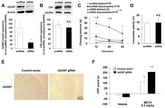 Effects of GAD67 knockdown on CB1 expression in mice striatum, apomorphine-induced climbing behavior, locomotor activity, and METH-induced CPP. Mice were injected with either scrRNA or GAD67 siRNA by stereotaxic injection into the right striatum. Experiments were started 3 days after stereotaxic injection. The protein expression of (A) GAD67 and (B) CB1 was detected by Western blotting with each specific antibody and normalized to β-actin or GAPDH. Data are expressed as the mean ± S.E. (n = 4–5 for each group; Student’s t-test; * p < 0.05 and not significant (N.S.) vs. vehicle group). (C) Climbing behavior was measured after administration of saline or apomorphine (1 mg/kg, i.p.). Data are expressed as the mean ± S.E. (n = number of mice) and were analyzed using three-way RM ANOVA and two-way RM ANOVA followed by Bonferroni post-hoc t-test (** p < 0.01 vs. siRNA-Saline group, ## p < 0.01 vs. scrRNA-Apomorphine group, ++ p < 0.01 and + p < 0.05 vs. siRNA-Saline group in each time zone, @ p < 0.05 vs. siRNA-Apomorphine group in each time zone). (D) Locomotor activity was measured for 60 min without any drug challenge. Data are expressed as the mean ± S.E. (n = 5–6 for each group; Student’s t-test; not significant (N.S.) vs. vehicle group). (E) The mice were stereotaxically injected with control or GAD67 gRNA CRISPR/Cas9 vectors. The mice striatum sections (10-μm-thick) were reacted with GAD67 antibody. Original magnification is ×200. (F) After GAD67 knockdown, 0.3 mg/kg METH-induced CPP scores (s) was measured by CPP test. Data are expressed as the mean ± S.E. (n = 9–14 for each group) and were analyzed using two-way ANOVA followed by Bonferroni post-hoc t-test (* p < 0.05 and ** p < 0.001 vs. each saline group; # p < 0.05 vs. Control vector/METH group). METH: methamphetamine.