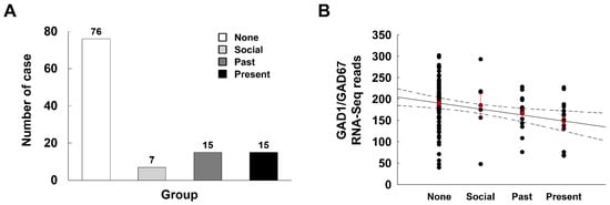 Correlation between GAD1/GAD67 gene expression in the human brain and the drug use severity ratings. (A) The number of cases in each drug use severity ratings. (B) The mean RNA-sequencing read counts of GAD1/GAD67 gene in each severity ratings. Data are expressed as raw data (●) and mean ± S.E. (X, red), and were analyzed using Pearson correlation test. The normal line is the plot of regression analysis and the dotted lines represent the 95% confidence intervals for the regression line.