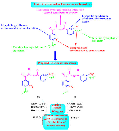 Over the last decade, evidence has emerged to support the efficacy of ionic liquids (ILs) as druggable molecules in a molten state [6]. The chemistry of ILs has become a hot topic since it is concerned with the design and development of newer scaffolds, as well as the ability to understand their medical properties and feature areas that guide their design and synthesis process [7,8].