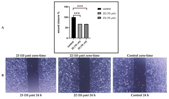 The wound healing assay was performed in A549 cells to evaluate the effect of the synthesized series on lung cancer cell migration, as shown in Table 3. The wound of the control sample was completely closed after 24 h. Compounds 22 or 23 were found to be the most effective against all cell lines tested and were thus investigated further. Cell migration was inhibited after 24 h of treatment with compounds 22 or 23 compared to untreated control cells. At 10 µM concentration, treatment of cells with each investigated compound resulted in approximately 67% inhibition of wound closure (Figure 2).