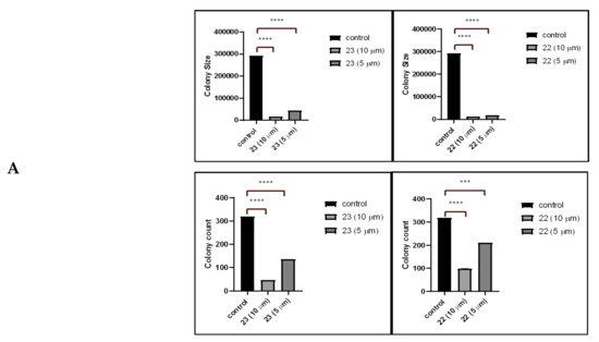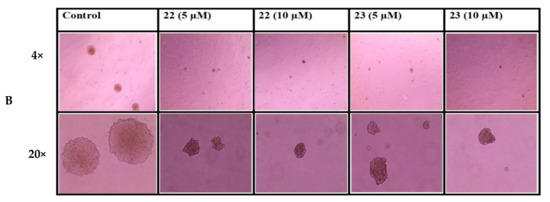 To investigate the effect of treatment with either potent compound 22 or 23 at two different concentrations (5 and 10 µM) on the colony-forming capability of lung cancer cells, A549 cells were treated with either concentration for 24 h. Afterwards, cells were grown on soft agar. As shown in Table 4, treatment with both compounds appears to inhibit cell colony formation by reducing the number and size of colonies compared to the control of untreated cells. Representative images taken at day 12 are shown in Figure 3.