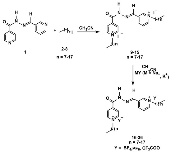 Synthetic route for the synthesis of dicationic pyridinium lipophile-based ionic liquids incorporating hydrazone anion 9–36.