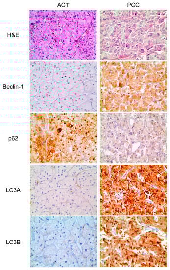 The expression of autophagy-related proteins was significantly different between PCC and ACT. In particular, the expressions of these proteins were associated with aggressive clinical features and patient prognosis, suggesting that the estimation of these proteins may be useful in the discrimination of adrenal gland tumors and the identification of patients with poor prognosis.