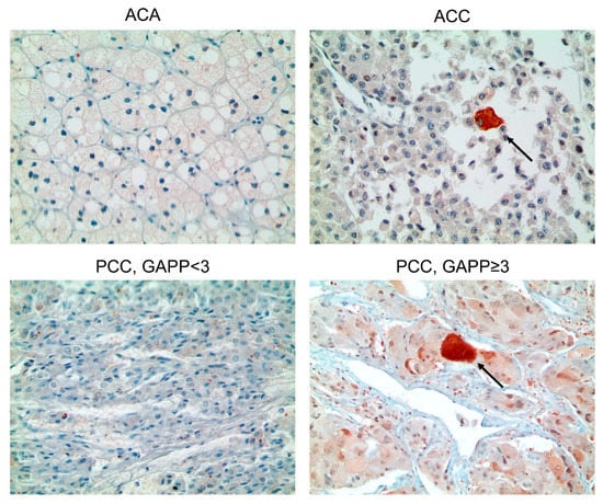 Isolated single positive cells (ISPC) of p62 and LC3B stain in adrenal tumors. The ISPC proportion of LC3B was higher in ACC than in ACA. The ISPC proportions of p62 and LC3B were significantly higher in PCCs with a GAPP score of ≥3 than in PCCs with a GAPP score of <3. Arrows indicate ISPC.