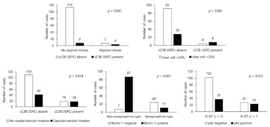 In ACT, LC3B (ISPC) positivity was associated with atypical mitosis (p = 0.001) and clear cell proportion (p = 0.001). In the presence of positive LC3B (ISPC), the proportion of atypical mitosis and the incidence of clear cells being < 25% was significantly higher (Figure 3). In PCC, the number of cells positive for LC3B (ISPC) was significantly associated with capsular/vascular invasion (p = 0.014). Furthermore, beclin-1 positivity was associated with norepinephrine type (p = 0.007), whereas p62 positivity was related to Ki-67 labeling index (L.I.) >1 (p = 0.012). The capsular/vascular invasion ratio was high in the presence of positive LC3B (ISPC). Meanwhile, the ratio of non-norepinephrine type was higher when beclin-1 expression was positive, and the ratio of Ki-67 L.I. > 1 was found to be higher in the case of cells positive for p62 expression (Figure 3).