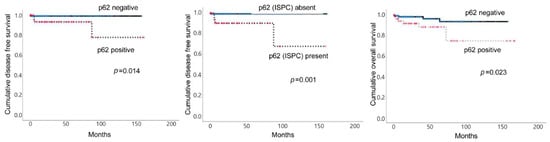 In the univariate analysis, p62 positivity (p = 0.014) and the presence of p62 (ISPC) positive cells (p = 0.001) were associated with shorter disease-free survival (DFS) in PCC. Moreover, p62 positivity (p = 0.023) was associated with shorter overall survival (OS) (Table 4 and Figure 4). The multivariate Cox analysis revealed that none of the autophagy-related proteins were significantly associated with DFS, but p62 positivity was predictive of shorter OS (relative risk, 6.240; 95% CI, 1.434-27.15; p = 0.015, Table 5). There was no significant relationship between the expression of the assessed autophagy-related proteins and patient prognosis in ACT (Table 6).