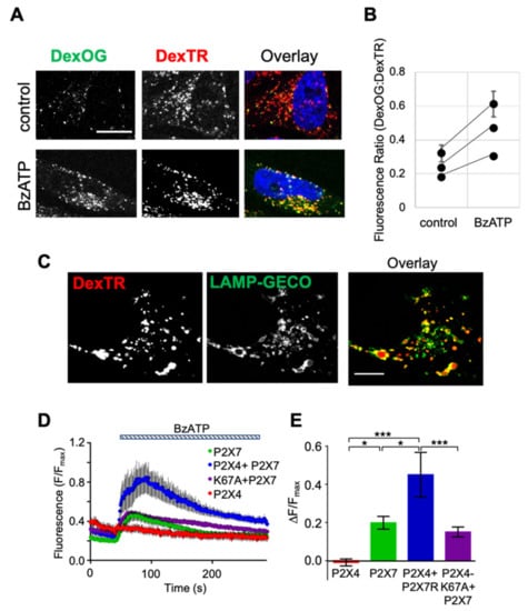 To further investigate the role of P2X4 receptors downstream of P2X7 receptor activation, changes in cytosolic free [Ca2+] ([Ca2+]c) in the immediate vicinity of lysosomes were measured using a genetically encoded low-affinity sensor ( = 1.2 μM), GGECO, fused to the cytosolic tail of LAMP1 (LAMP1-GECO) []. The low affinity of this sensor ensures that local rather than global changes in [Ca2+]c are reported. The targeting of LAMP1-GECO to lysosomes was shown by its colocalization with DexTR (Figure 3C). BzATP evoked changes in near-lysosome [Ca2+]c, and the peak amplitudes of these responses were significantly larger in cells co-expressing P2X4 and P2X7 receptors compared to cells expressing only P2X7 receptors or P2X7 with the P2X4-K67A receptor mutant (Figure 3D,E). As expected, there was no response to BzATP from LAMP-GECO in cells expressing P2X4 receptors without P2X7 receptors, consistent with BzATP being a poor agonist of P2X4 []. These results, showing that activation of P2X7 receptors evokes significantly larger near-lysosome cytosolic Ca2+ signals when functional P2X4 receptors are expressed, consistent with P2X4 receptors mediating Ca2+ release from lysosomes.