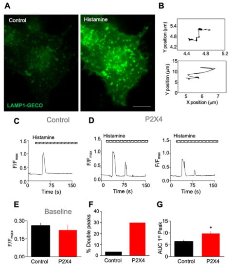 Given the association of IP3 receptors with ER–lysosome contact sites [], we wanted to determine if a receptor that stimulates IP3 production and the release of Ca2+ from the ER can exhibit functional crosstalk with lysosomal P2X4 receptors. Experiments were carried out in HeLa cells, which endogenously express histamine H1 receptors, and localized Ca2+ signals were again detected using LAMP1-GECO. To resolve the behavior of individual lysosomes, which move rapidly, LAMP1-GECO fluorescence was recorded from individual, tracked lysosomes (Figure 4A,B), and these responses came close to saturating the low-affinity indicator (Figure 4C,D). Baseline fluorescence was unaffected by expressing P2X4 receptors, but histamine stimulation evoked two temporally distinct peaks in ~30% of lysosomes, whereas a second peak was extremely rare in control cells (Figure 4C–F). In addition, the area under the curve (AUC) for the first peak was significantly larger in cells expressing P2X4 receptors compared to control cells (Figure 4G). These results suggest that P2X4 receptors release Ca2+ from lysosomes downstream of H1 receptor stimulation.