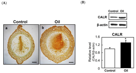 Expression of calreticulin (CALR) in the artificially induced decidua. Female rats were mated with vasectomized males and sesame oil (100 μL) was infused into the lumen of one uterine horn on day 5 of pseudopregnancy to induce artificial decidualization. The uteri were dissected 48 h after the infusion. Immunostaining of CALR in control (Aa) or oil injected horn (Ab). Scale bars = 250 μm. Immunoblot analyses of CALR expression in the uteri of control or those injected with sesame oil (B). The graph shows the relative level of CALR normalized to that of β-actin. Data represent the mean ± SEM (n = 3). * p < 0.05.