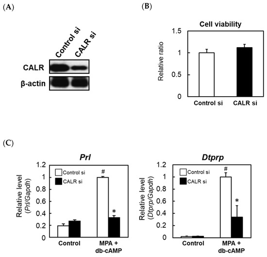To explore the function of increased CALR expression in decidualizing cells, rat ESCs were transfected with a CALR-specific siRNA. Immunoblotting confirmed that transfection with the specific siRNA reduced CALR protein levels in cultured stromal cells (Figure 4A). Cell viability was not affected by the knockdown of CALR (Figure 4B). Enhanced expression levels of prolactin (PRL) and decidual/trophoblast prolactin-related protein (DTPRP) are markers of decidualization in rats; therefore, we examined the effects of knocking down CALR on Prl and Dtprp expression. In rat ESCs transfected with a non-specific control siRNA, decidual stimulation by co-treatment with medroxyprogesterone (MPA) and dibutyrly (db)-cAMP increased the expression levels of the Prl and Dtprp mRNAs significantly (Figure 4C). However, the knockdown of CALR attenuated these responses significantly (Figure 4C).