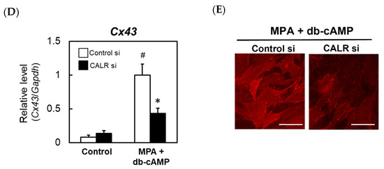 Cx43, a membrane-spanning connexin protein that forms gap junctions, is expressed in the decidual zone, and both Cx43 and gap junctions are required for ESC differentiation [16]. Therefore, we examined whether Cx43 is regulated by CALR. The treatment of control rat ESCs with MPA and db-cAMP increased Cx43 mRNA expression significantly, and this increase was attenuated by the siRNA-mediated knockdown of CALR (Figure 4D). A reduced expression of Cx43 protein in CALR knockdown cells was also confirmed by an immunocytochemical analysis (Figure 4E).