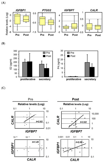 Endometrial polypectomy reportedly improves the rate of pregnancy in women previously diagnosed as infertile [15], although the evidence from clinical studies is scarce and conflicting [17,18]. To determine whether polypectomy influences the expression of implantation-related factors, we examined the effects of excision on the expression levels of the IGFBP1, IGFBP7, PTGS2, and CALR mRNAs in 27 patients with endometrial polyps. Pre-polypectomy samples were collected from normal areas of the endometrium during surgery and post-polypectomy samples were collected from the same patients 1–2 months later. The expression levels of IGFBP1 and PTGS2 tended to decrease after the surgery, whereas those of IGFBP7 and CALR increased slightly (Figure 5A). Polypectomy had no significant effect on the serum levels of E2 and P4 in the luteal phase (Figure 5B). Among all factors examined, the strongest positive correlation before polypectomy was observed for IGFBP7 and CALR, and the strength of this correlation increased further after excision (Figure 5C).