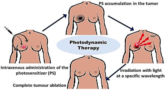 Morrison and other colleagues showed the effectiveness of PDT in the treatment of cutaneous and subcutaneous metastatic breast cancer, following mastectomies. They observed a positive histologic response, indicating tumor apoptosis and regression. They also reported an improved quality of life in the patients []. Table 1 shows the summary of clinical trials dedicated to PDT on breast cancer, the phases of the study, and the stages of the trials.