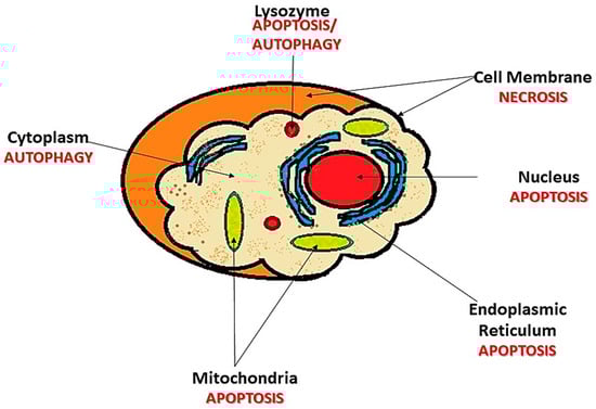 Necrosis is another type of cell death, resulting from cell membrane integrity loss due to severe cell injury [] (Figure 3). The consequences of necrosis include the release of cellular contents into the surrounding tissues and therefore, triggering an inflammatory response []. Moreover, necrotic cells tend to go through a process of oncosis, which ends in cell rupture. In contrast to apoptosis, necrosis is an energy-independent form of cell death, where the cells are damaged severely by a sudden shock (radiation, heat, chemicals, hypoxia, etc.) For decades, necrosis has always been accepted as the only mode of cell death post-PDT treatment. This seemed true when observed from the endpoint state of cells in vivo. This is because the presence of cellular fragments, resulting from the late apoptotic cells, was assumed to have been due to necrotic cell death.