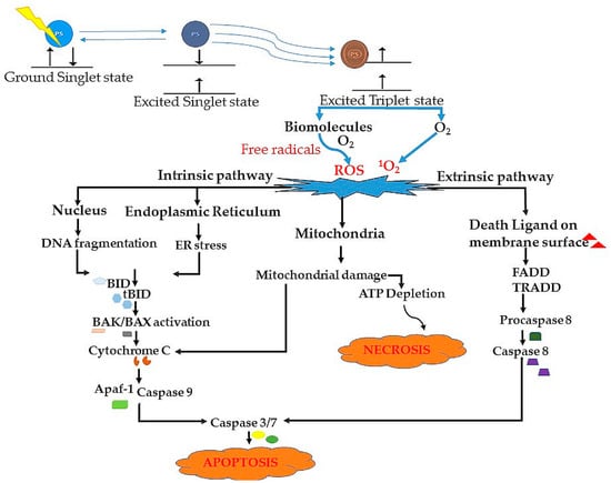 PDT activation of the apoptotic and necrotic pathways. During PDT, the PS becomes activated from its singlet ground state to its excited singlet state. With continued light irradiation the PS undergoes an intersystem, crossing to its excited triplet state. Two types of reactions can occur depending on the availability of free radicals and molecular oxygen. These include type I and type II reactions. In type I, photo-oxidation occurs with the use of free radicals, while in type II reactions it occurs with the use of molecular oxygen. The apoptotic pathway will take place via the intrinsic or extrinsic pathway. Intrinsic pathway results from DNA fragmentation and ER stress. Extrinsic pathway is activated by the death ligand on the membrane surface. Necrosis will occur due to ATP depletion.