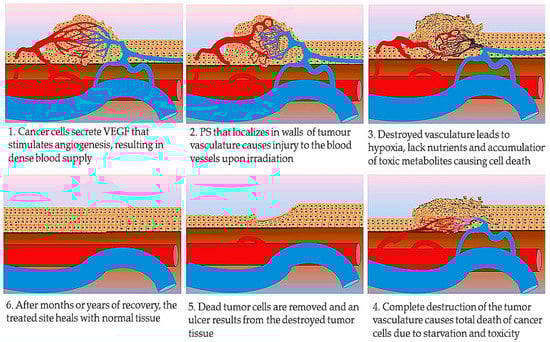 One of the features of a tumor that enables it to survive in the body is the increased vascularization that occurs in tumor tissues. This results from the increased secretion of VEGF by tumor cells that initiate neovascularization in the tissue. This is a necessary mechanism of tumors to increase perfusion of blood into the expanding tissue, that supply the cancer cells with enough oxygen, nutrients, and enable the excretion of metabolic by-products, otherwise, the tumor would die. PDT takes advantage of this occurrence. After PS administration, some PS may localize in the walls of the tumor vasculature. Upon irradiation, the PS absorbed by the endothelial cells of the tumor vasculature undergoes a similar activation process. This destroys the blood vessel walls and leads to the disruption of blood supply to the tumor tissue. When the blood supply is disrupted, the dense tumor cells are starved of nutrients, oxygen, and other blood elements. Additionally, the metabolic waste products from the cell metabolism start accumulating in the tissues [,]. All these together lead to cell death, as summarized in Figure 4.
