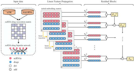 Flow chart of LRGCPND. denotes the embedding matrix in layer 0. and denote the embedding of ncRNA n and drug d in layer 0, respectively. LRGCPND contains three steps: aggregation, linear transition, and residual learning. In the feature aggregation step, we use the spectral rule to aggregate the features of neighboring nodes. After that, the linear transformation is adopted to speed up the forward propagation. Finally, we add a residual block to fuse the characteristics of low-layer nodes directly, attaining higher-layer potential features.