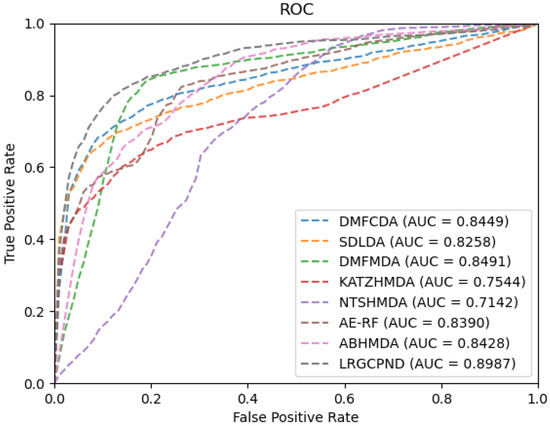 For the sake of rigor, we need to point out that since AE-RF [29] and ABHMDA [33] employ other similarity-based features besides the Gaussian interaction profile (GIP) kernel similarity. Considering the scarcity of relevant biological resources and convenience, we only calculated the GIP similarity for them in the experiments. Furthermore, the adjacency matrix allocated at the beginning of training is different, so the topology information of the interaction network needs to be re-extracted. We re-calculated the GIP similarity matrices during each cross-validation process for similarity-based methods, AE-RF, KATZHMDA [32], NTSHMDA [35], and ABHMDA. As plotted in Figure 5, it is evident that LRGCPND leads others with the average AUC value of 0.8987, which is 5.84% higher than the second-best method DMFMDA [34].