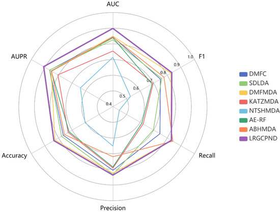 From statistics of various metrics listed in Table 4, except that the Recall value is slightly lower than ABHMDA, our model yields the optimal identification ability. Its AUPR, Accuracy, and F1 values achieve 0.9094, 0.8342, 0.8335, respectively. We also drew a radar chart to intuitively and comprehensively measure the capabilities of diverse models through various metrics, as shown in Figure 6. All six evaluation metrics range from 0.4 to 1.0. The farther the point from the center of the circle, the higher the value. It is also apparent to conclude that LRGCPND advantages over other methods.