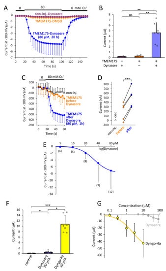 In a preparation of Xenopus laevis oocytes expressing mouse TMEM175 channel, the average cesium current was 0.29 ± 0.13 µA in the plasma membrane, measured by the two-electrode voltage clamp technique in 80 mM extracellular (EC) [Cs+], at −100 mV (n = 7, Figure 1A,B). In sharp contrast, in response to the overnight application of dynasore (80 µM, 20 h), the cesium current increased to 4.6 ± 1.9 µA (n = 7, p < 0.005). The same dynasore treatment did not result in similar Cs+ conductance in the non-injected control oocytes (0.18 ± 0.06 µA, n = 6, p < 0.005, compared to the currents induced by dynasore in the cells expressing TMEM175). Dynasore increased the average TMEM175 current approximately 40-fold, if the baseline of non-injected cells is subtracted in the calculation; indeed, even without this correction, the increase is substantial, at about 16-fold. In this experiment, the currents were measured in 80 mM EC [Cs+] in order to better discriminate TMEM175 from the endogenous K+ channels, and at −100 mV, to suppress the depolarization-activated current components of the oocytes.