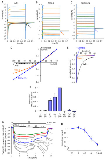 Slow deactivation of Kv2.1 produced large tail currents during the voltage steps to −60 mV after the depolarizing prepulses (black arrow in Figure 2A, and black curve in Figure 2E). The tail currents of Kv2.1 are more prominent than those of TASK-3, because of the limited voltage-dependence and rapid deactivation of K2P channels (orange arrow in Figure 2B, and orange curve in Figure 2E). However, the tail currents of TMEM175 could not be detected (blue arrow in Figure 2C), the exponentially decaying component is not present (Figure 2E), in good accordance with the lack of voltage-dependent activation. In summary, with respect to its current kinetics, TMEM175 more completely fulfils the criteria for an ideal background potassium channel than TASK-3.