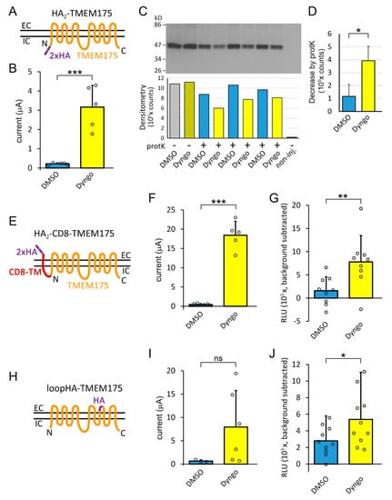 In order to confirm the increase of channel number in the plasma membrane by dyngo-4a, we have also taken another approach. We applied two strategies to design functional TMEM175 constructs with extracellular HA-tags. In the HA2-CD8-TMEM175 construct, a fragment of human CD8 protein containing a single transmembrane segment was connected to the N-terminus of TMEM175, and also appended with an extracellular double HA-tag at the N-terminus of the CD8 fragment (Figure 4E). In the other loopHA-TMEM175 construct, a short region of the fifth extracellular loop of TMEM175 was replaced with the HA-tag amino acid sequence (Figure 4H). The CD8-based construct was clearly functional, and responsive to dyngo-4a (Figure 4F). The internally tagged construct also showed the tendency for increased K+ current in response to the application of dyngo-4a (p = 0.07, Figure 4I).