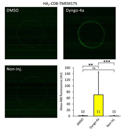 Confocal microscopy indicates that TMEM175 surface expression is increased after the application of dyngo-4a. The upper two images show the representative optical sections of Xenopus oocytes expressing the HA2-CD8-TMEM175 construct, and fixed after the application of Dyngo-4a (10 μM, 20 h) or DMSO, as indicated on the panels. The extracellular HA-tags were detected by the binding of a mouse anti-HA primary antibody, followed by an anti-mouse secondary antibody conjugated with Alexa Fluor 488. The left lower panel (Non-inj.) shows the background immunofluorescence of a representative non-injected control oocyte after identical immunostaining. The surface immunofluorescence was significantly more intense after the application of dyngo-4a on the oocytes expressing HA2-CD8-TMEM175 than after the treatment with DMSO, or that of the non-injected cells, as indicated on the column graph. The numbers above (or in) the columns indicate the number of measured oocytes. For the whole image set, see supplementary Figure S4. ** p < 0.01, *** p < 10−4 (multiple comparisons after Kruskal–Wallis ANOVA), ns: not significant.