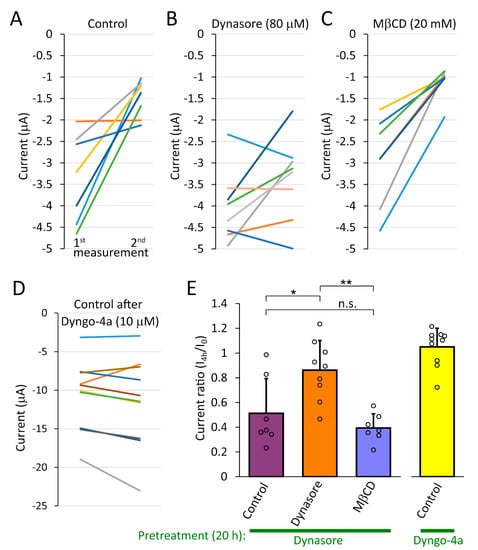 TMEM175 current rapidly decreases after the withdrawal of dynasore. (A–C). Mouse TMEM175 K+ current was measured in Xenopus oocytes after 20 h treatment with 80 μM dynasore (1st measurement). The cells were subsequently incubated under different conditions for 4 h: in control medium ((A). Control), in the continued presence of 80 μM Dynasore ((B). Dynasore), or in the presence of 20 mM methyl-β-cyclodextrin ((C). MβCD), and finally, the K+ current was measured again in the same cell (2nd measurement). Each colored line interconnects the two current values of a single cell. Two lines nearly overlap in (C). (D). TMEM175-expressing oocytes were treated overnight with 10 µM dyngo-4a, and subsequently the K+ currents were measured twice as in panel A, before and 3.5 h after the withdrawal of the inhibitor (i.e., after the incubation in control medium, Control). (E). Statistical analysis of the data shown in panels A, B, C, and D. The currents were normalized to the initial value at the 1st measurement (Current ratio, I4h/I0). One cell with high TMEM175 expression (9.9 to 8.8 μA) in the Dynasore group is shown only here, but not in panel B. * p < 0.02, ** p < 0.002 (one-way ANOVA, Tukey HSD test).
