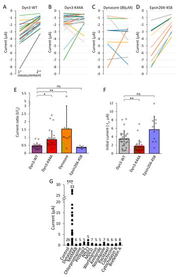 The effects of dominant-negative dynamin coexpression and different inhibitors of endocytosis on the TMEM175 current. (A–F). The effects of dominant-negative dynamin coexpression on the TMEM175 current induced by dynasore, and the decay of this current after the withdrawal of the inhibitor, were examined. The degree of TMEM175 current reduction was measured in four groups of oocytes treated with dynasore (80 μM, 20 h), using the protocol introduced in Figure 6. The cells were incubated for 4 h in the absence or presence of dynasore before the second measurement of TMEM175 current. Each colored line indicates the current change in a single cell. The oocytes derived from two preparations. (A). In the negative control group (Dyn3-WT), TMEM175 was coexpressed with wild type dynamin-3, and dynasore was absent between the two measurements of the K+ current. (B). In this group (Dyn3-K44A), TMEM175 was coexpressed with dominant-negative K44A mutant dynamin-3, and dynasore was absent between the two measurements. (C). In the positive control group (Dynasore (80 μM)), TMEM175 was coexpressed with wild type dynamin-3, however, dynasore was present between the two measurements. (D). In this group (Epsin204-458), TMEM175 was coexpressed with the clathrin-mediated endocytosis inhibitor DPW domain of epsin, and dynasore was absent between the two measurements. (E,F). Statistical analysis of the data shown in panels A–D. The currents were normalized to the initial value at the 1st measurement (Current ratio, I/I0, (E)) or the initial current amplitude (−I0 at the 1st measurement) is plotted (F). Current data of the 1st measurements from panels A and C are pooled for the Dyn3-WT group of panel F (first grey column). One cell with high TMEM175 expression (11.9 to 4.3 μA) in the Epsin204-458 group is shown only in panel E and F, but not in D. The omission of the data point of 5.34-fold current increase from the Dynasore (80 μM) group would not affect the statistically significant differences in this experiment. * p < 0.02, ** p < 0.002 (multiple comparisons after Kruskal–Wallis ANOVA), ns: not significant. (G). Different inhibitors of endocytosis and modulators of cytoskeleton do not induce TMEM175 current in the plasma membrane. The oocytes expressing mouse TMEM175 were treated with the different pharmacological agents, as indicated below the graph. Each point represents a measured cell, and the number of cells is shown above the data points. The oocytes derived from six preparations and the control and dynasore-treated cells were measured from each preparation. Control cells were incubated without the active compounds, in the presence of the vehicle (DMSO), where appropriate. The applied concentrations were the following: Dynasore (80 μM), MitMAB (tetradecyl-trimethyl-ammonium-bromide, 15 μM), Chlorpromazine (50 μM), PitStop2 (40 μM), NH4Cl (15 mM #), MβCD (Methyl-β-cyclodextrin, 40 mM #), Wortmannin (1 μM), Amiloride (1 mM), Nocodazole (1 μM), Paclitaxel (50 nM), Colchicine (10 μM), Cytochalasin B (10 μM), Brefeldin A (5 μM). (# the osmotic concentration was higher during these treatments.) The compounds were applied overnight (for 20 h). *** p < 10−6 (Kruskal–Wallis ANOVA).