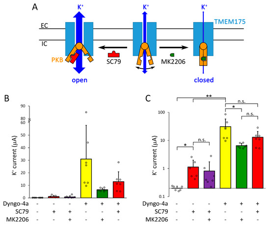 The effects of SC79, MK2206 and dyngo-4a on TMEM175 current. (A). Schematic illustration of TMEM175 regulation by the binding of SC79 or MK2206 to protein kinase B (PKB). (B). The oocytes expressing TMEM175 were incubated in the presence or absence of dyngo-4a (10 μM), SC79 (20 μM), and MK2206 (20 μM) for 20 h, as indicated below the graph. TMEM175 inward currents were measured in 80 mM K+ at −100 mV. (C). The same data as in panel B are plotted on a logarithmic scale to clearly visualize the differences among the groups. Statistical analysis was performed on log-transformed data. * p < 0.05, ** p < 0.001 (Welch’s ANOVA, Dunnett T3 post hoc test), n.s.: not significant.