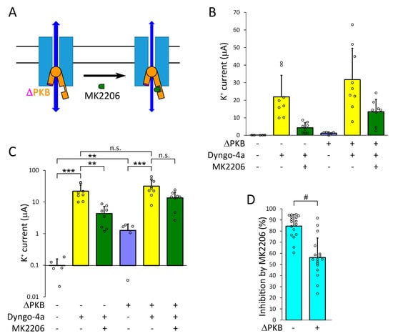 The coexpression of the constitutively active, PH domain deleted protein kinase B (ΔPKB) construct with TMEM175 results in small K+ currents, and reduces the MK2206-mediated inhibition of the TMEM175 current induced by dyngo-4a. (A). Schematic illustration that the degree of TMEM175 current inhibition by MK2206 is reduced, when full length protein kinase B is replaced by ΔPKB in the TMEM175-PKB protein complex. (B). The oocytes expressing TMEM175 alone, or coexpressing the channel with ΔPKB, were treated with dyngo-4a (10 μM) or dyngo-4a plus MK2206 (20 μM) for 20 h, as indicated below the graph. TMEM175 inward currents were measured in 80 mM K+ at −100 mV. (C). The same data as in panel B are plotted on a logarithmic scale to visualize the differences among the groups. Statistical analysis was performed on log-transformed data. ** p < 0.005, *** p < 0.0005 (ANOVA, Tukey HSD post hoc test), n.s.: not significant. (D). Relative inhibition of TMEM175 K+ current by MK2206 was determined in the absence or presence of ΔPKB, as indicated below the graph. The experiment illustrated in panel B was repeated in another oocyte preparation with identical results, and the data points of the currents inhibited by MK2206 (data points of the green columns) were normalized to the average current in the absence of MK2206 (yellow columns). Note that the coexpression of ΔPKB reduced the inhibition of TMEM175 current by MK2206. # p < 10−4 (Mann–Whitney U-test).