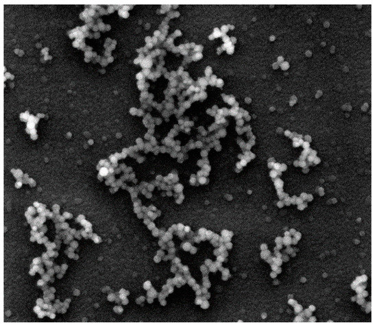 A scanning electronic microscopy image of a silicon dioxide sample illustrating the process of diffusion-limited aggregation that proceeds simultaneously with the cluster-cluster aggregation (image size 40 μm × 40 μm).