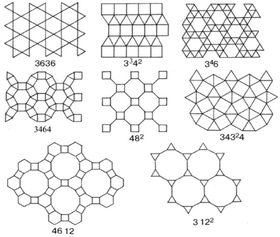 The Kepler nets consist of regular polygons, not necessarily of the same kind. Regular polygons (triangles, squares, hexagons, octagons, dodecagons) and their combinations fill in the flat space without gaps and overlapping. The Schläfli symbols indicate the number and type of regular polygons converging at each node of the net. The Arabic numbers correspond to the following shapes: 3 to a triangle, 4 to a square, 6 to a hexagon, 12 to a dodecagon. The top number indicates the number of polygons converging on the same node and touching each other by their sides. Number 4612 means that the net node is a vertex of one triangle, one hexagon, and one dodecagon. A square in the Kepler net with the Schläfli symbol 4612 (Figure 7) was replaced in the article by a regular hexagon with the side equal to the side of the square (Figure 8).