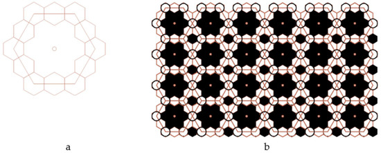 Thus, we obtained a large hexagon, the vertices of which pass through 12 regular small hexagons, and the side of which is equal to the quadruple radius of a circle inscribed into a small regular hexagon (Figure 9a). Modeling was performed in the AutoCAD 2022 2D and 3D computer-aided design and drawing software application developed by Autodesk (Figure 9b).