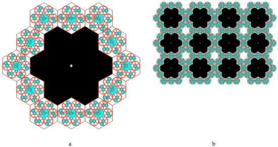 Each regular hexagon in the enhanced Kepler net with Schläfli 4612 symbol was filled a quasi-two-dimensional projection of a 3D enhanced non-deterministic Jullien fractal [34] after the second iteration (Figure 10).