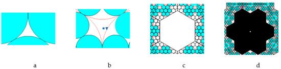 The pore radius of the fourth type was defined as the radius of the circle inscribed in the regular hexagon which is inscribed in the fourth type pore of irregular shape (Figure 11d) with accounting for the graphical definition of the side of the regular hexagon . Then